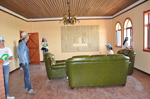 酒庄”几个大字字体略显稚拙,李生保师兄介绍说,这也是为了体现酒庄返璞归真的理念。进入酒庄,内部设计古朴典雅,主打黄色暖色调。原木设计,壁柜,家具风格、陈设,甚至灯饰都体现出独特的创意,融汇当地历史文化,带给人灵感和美好。师兄说,酒庄划分了办公、会议活动、展览大厅、住宿接待、中西餐饮、台球娱乐、KTV等多个功能区。依托当地的旅游资源,后期还会有旅游小木屋,房车营地建设。