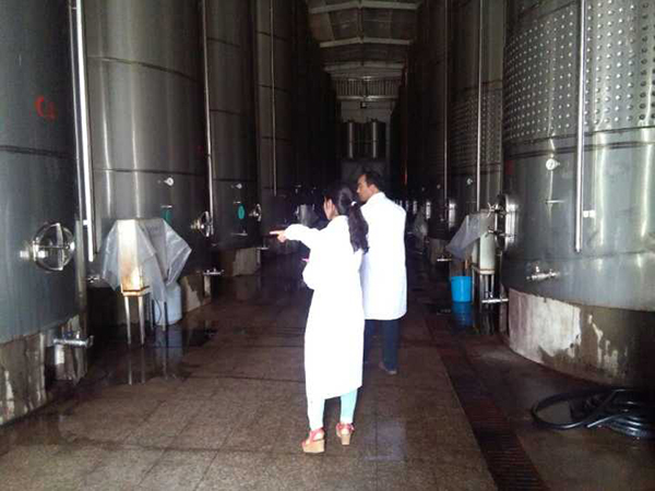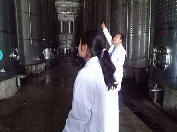 酒业有限公司第二天,在主任带领下参观了酒厂酿酒车间和罐装车间。酒厂规模很小,年产3000吨酒。主任详细介绍了酒厂设备,50吨,80吨发酵罐,储酒罐,罐装生产线(冲瓶、罐装、打塞三联机,贴标)、装箱、叉车装卸堆垛等。