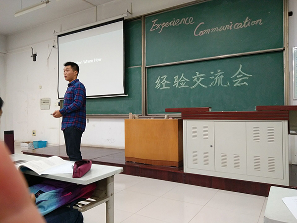第四位上台分享自己四六级考试经验的是15级的朱子健学长。朱子健学长通过自己对大学英语四级题型的解读与介绍,分享了自己四六级考试的备考方法和考试技巧。内容充实,很有实际意义。同时也给即将参加四级考试的提出了注意事项,给三个月后即将参加四级考试的同学们吃了颗定心丸。同学们纷纷或拍照,或记笔记来记录这些金玉良言。