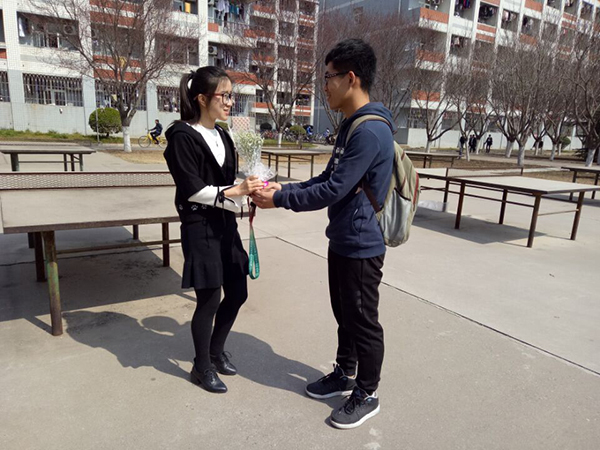在北校西区八号宿舍楼下举办以“遇见最好的自己”为主题的女生节系列活动。工作人员们早早来到女生宿舍楼下集合,为即将回到宿舍的少女们送上节日的惊喜。