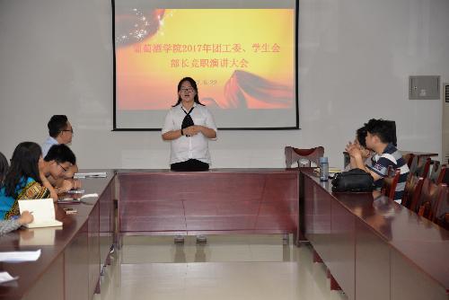 团工委老师以及上一届团工委学生会负责人针对学生工作中可能出现的问题分别对竞职候选人进行了提问。“如何调节部长与各副部、部委之前的关系?”“如何凝聚部内的凝聚力与积极性?”面对这些问题,各竞选者就个人工作经验分别提出了可行的方法和个人的见解。