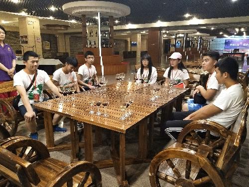 小队成员在工作人员的带领下进入了紫轩酒庄,紫轩作为国家4A级工业旅游景区有着一套系统的参观路线,还配备会员制小型高级休闲会所、主题休闲区、专业地下酒窖和鉴赏中心等特色功能区。酒庄的大门前有以欧洲小镇的建筑风格为蓝本的喷泉,绕过喷泉走进有欧美伦理电影