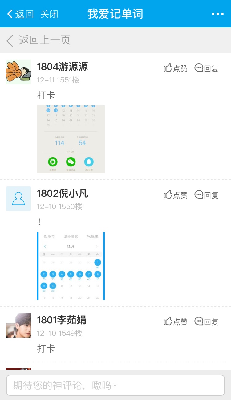 同学们于每日晚11点前将当日记忆单词截图发送至易班,可使用任何软件记忆单词,比如百词斩,知米背单词,英语四级君等。活动结束,易班将会统计每个人的单词记忆数量及打卡天数,最后进行排名。