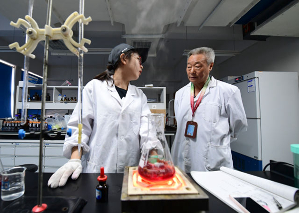 实验室内对正在做实验的学生祝悦进行指导。