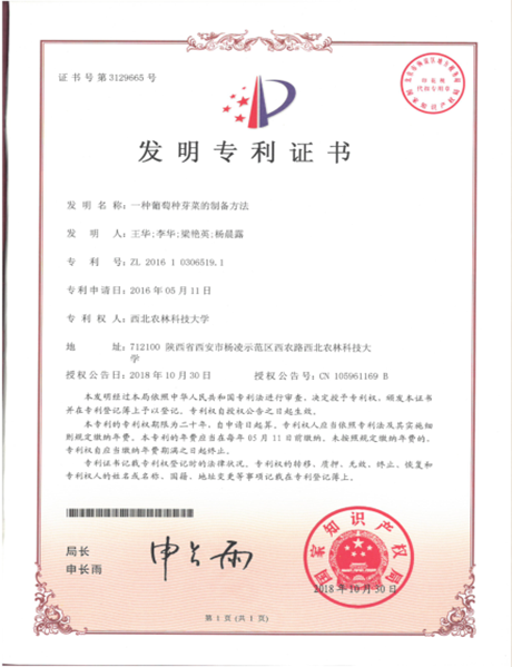 种芽菜的制备方法》,发明人:王华;李华;梁艳英;杨晨露,专利证书号:第3129665号,专利号:ZL 2016 1 0306519.1。