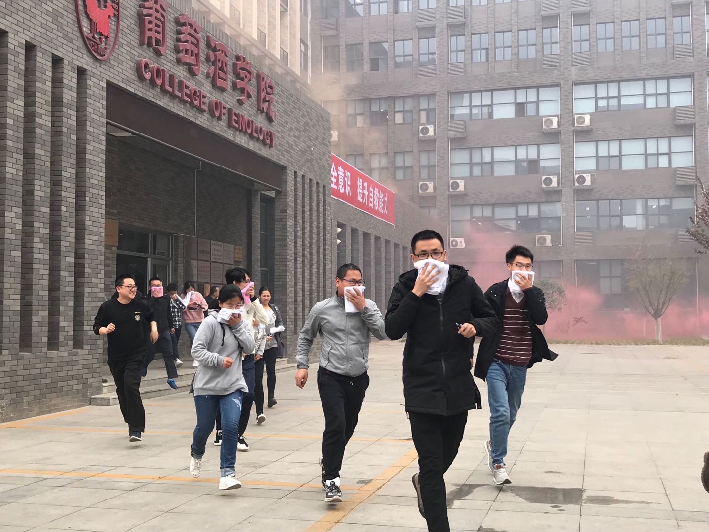 随后根据统一部署,食品科学大楼二楼A、B、C区开始点燃烟雾弹,正式拉开了演练序幕。