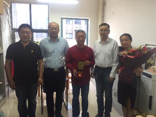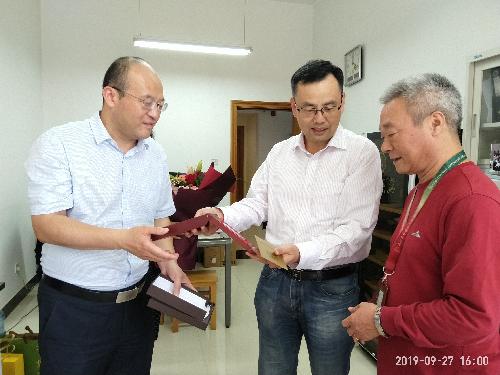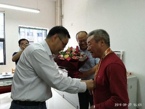 李华教授送达由中共中央、国务院、中央军委颁发的“庆祝中华人民共和国成立70周年纪念章”,赠送鲜花。