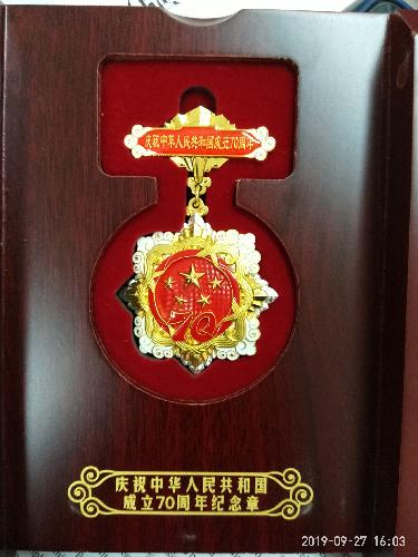 铜胎底镀金的纪念章包含5种设计元素:其中五星代表国家荣誉;“70”飘带象征中华人民共和国70年奋斗历程;团锦结寓意全国各族人民大团结,构建人类命运共同体的愿景;如意祥云象征人民对美好生活的向往;光芒表达隆重庆祝中华人民共和国生日,礼赞国家富强、民族振兴、人民幸福的辉煌成就,以及在70年辉煌奋斗成就的基础上,不忘初心、继续前进的坚定决心。