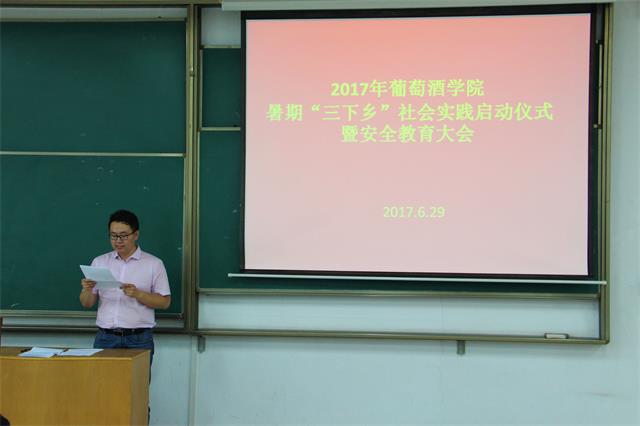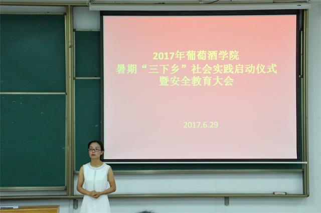 2017年暑期社会实践安全责任书》的全部条款,引导学生树立安全实践意识,确保各项实践活动在安全的前提下顺利开展。校级 “三下乡”社践团队队长靳思雨代表“三下乡”社会实践的全体同学郑重承诺:牢记实践安全,追求实践成效,以良好形象和实际行动展现葡酒学子风采。