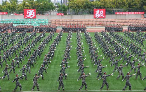 2017级新生以匕首操和军体拳表演接受了检阅,以英勇顽强的表现为持续两周的军训工作画上了精彩的句号。